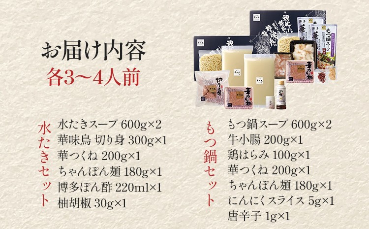 水たきともつ鍋。博多の2大鍋がお楽しみいただけるセットです。 【水たき】 九州産銘柄鶏「華味鳥」は、太陽の光と自然の風が入る平飼いの開放鶏舎で、海藻やハーブ、ぶどうの絞り粕や木酢液などと共に、腸内環境を整える飼料を与え健康的に育てられた鶏です。その肉質は鶏特有の臭みが抑えられ、はっきりとした旨みと歯ごたえがあります。博多・中洲に本店を構え、大阪・東京にも店舗展開する「水たき料亭 博多華味鳥」の吟味されたスープと素材をご家庭でお楽しみいただけます。水たき料亭オリジナルのぽん酢と一緒にご賞味ください。 【もつ鍋】 博多が全国に誇るスタミナ食の代表「もつ鍋」は新鮮な「もつ」とスープが決めてです。水たき料亭「華味鳥」流にアレンジを加え、九州産銘柄鶏「華味鳥」のハラミと牛もつとを組み合わせたオリジナルなもつ鍋セットを作りました。プリップリの牛小腸に鶏の中で少量しか取れないハラミを加えることで、醤油味のもつ鍋スープとも相性の良い食べやすくボリューム感のあるもつ鍋に仕上がりました。キャベツやにらを加えてお召しあがりいただいた後は、ちゃんぽん麺でしめくくるところまで博多の醍醐味をご家庭でたっぷり楽しんでいただけるセットです。 ■使用方法・食べ方 【水たき】 1.スープを火にかけ煮立ち始めたら、あらかじめ解凍しておいた鶏肉、つくねを入れていきます。沸騰したら丁寧にアクを取り除いた後、スープをご賞味ください。 2.野菜や豆腐などお好みの具材を入れ、火が通ったら、.取り鉢にぽん酢とお好みの薬味(ネギ・柚胡椒など)を入れ、鶏肉、つくね、野菜をお召しあがりください。(キャベツを入れるのが博多流。) 3.最後に残ったスープで、ちゃんぽん麵やごはんを入れて雑炊をお楽しみください。(たまごやあさつきを散らすと美味しくいただけます。) 【もつ鍋】 1.スープを火にかけ煮立ち始めたら、解凍しておいたを牛もつ、鶏はらみ、華つくねを入れます。 2.もつ、つくねに火が通ったところでキャベツ、にら、ごぼうなどを鍋にフタをするように多めにいれます。(にんにくスライス、唐辛子はお好みの量入れてください。) 3.もつ、つくね、野菜が食べ終わる頃に残ったスープにちゃんぽん麺を入れて煮込み召しあがりください。