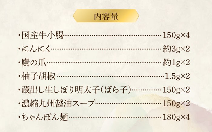 | 容量 | 【内容量】 ・国産牛小腸 150g×4 ・にんにく約3g×2 ・鷹の爪約1g×2 ・柚子胡椒1.5g×2 ・蔵出し生しぼり明太子(ばら子) 150g×2 ・濃縮和風醤油スープ 150g×2 ・ちゃんぽん麺 180g×4 【原料原産地】 牛小腸(国産) ちゃんぽん麺:小麦粉(国産)、加工でんぷん、かんすい、卵白(卵含む)、食塩、クチナシ色素 【加工地】 福岡県 |