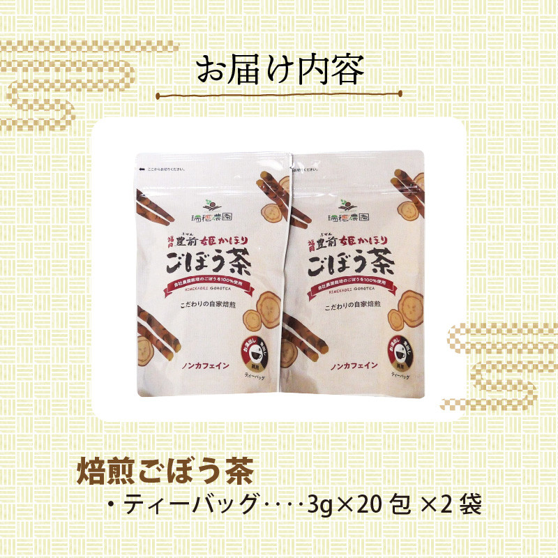 豊かな大地の香りと甘みを楽しめる手軽なティーバッグです。 「姫かほり」 ごぼう茶 ティーバッグ(3g×20包)× 2袋 K04303