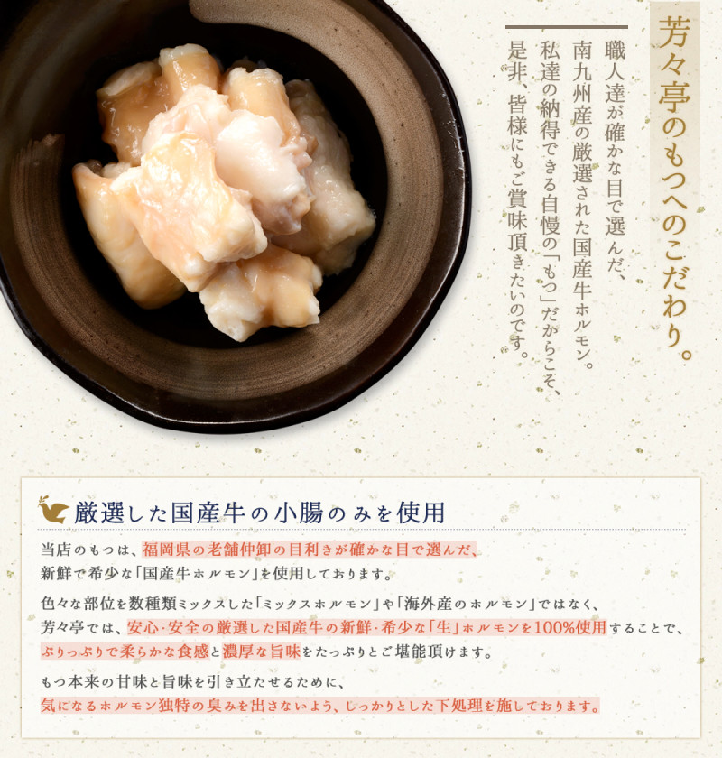 | 容量 | ・国産牛ホルモン250g ・九州産豚ロース200g ・古処鶏つみれ150g ・ちゃんぽん麺150g×2 ・辛味噌スープ450g ・柚子胡椒、鷹の爪、白ごま |