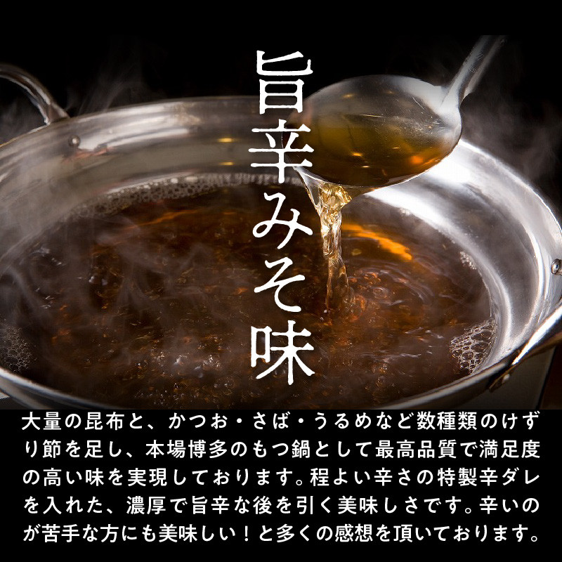 大量の昆布と、かつお・さば・うるめなど数種類のけずり節を足し、本場博多のもつ鍋として最高品質で満足度の高い味を実現しております。