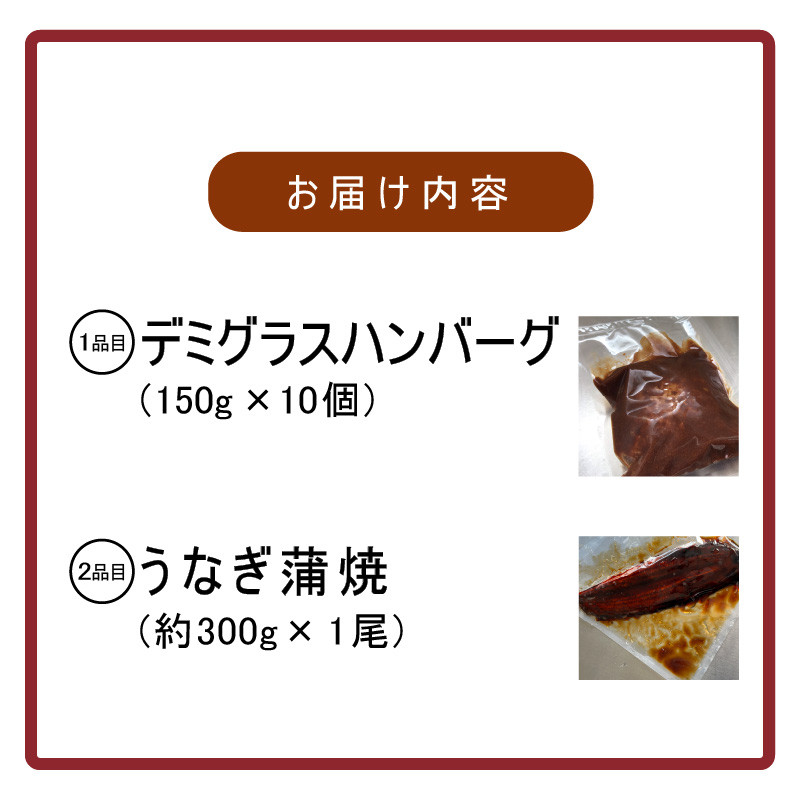 | 容量 | ・デミグラスハンバーグ 150g×10個 ・うなぎ蒲焼 約300g×1尾 |