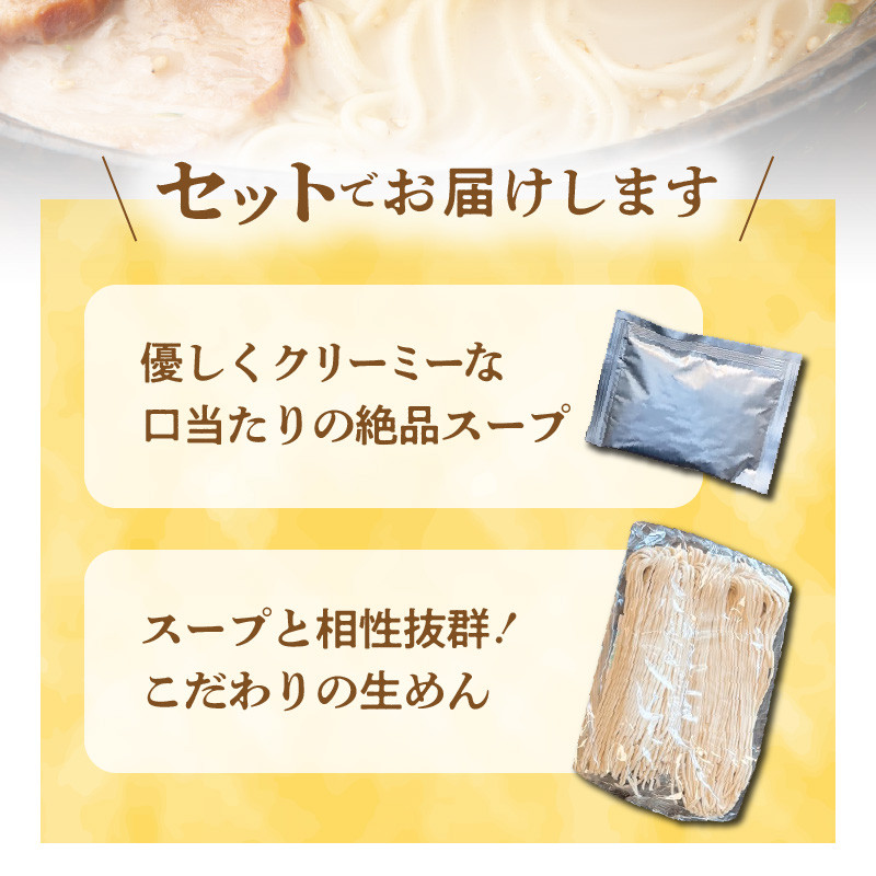 ガツンとくるタイプの豚骨スープではなく、優しくクリーミーな口当たりの絶品スープに、相性抜群のこだわり生めんをセットにしました。