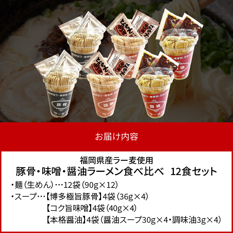 シェアやおすそわけに!カップ入り特製ラー麦麺の食べ比べセット 【福岡県産ラー麦使用】醤油・豚骨・味噌ラーメン食べ比べ 2食入り×各2セット(合計12食) PC7106