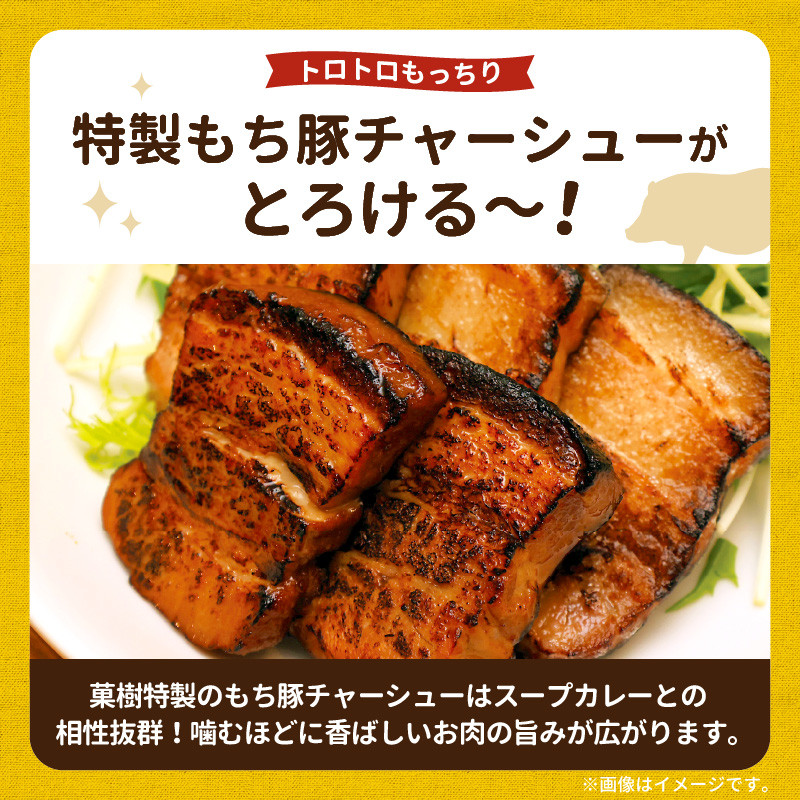 野菜がたっぷり入った農園野菜スープカレーに、菓樹特製のトロトロもっちりなもち豚チャーシューをトッピングしたスープカレーです。