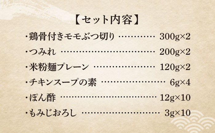 セット内容:鶏骨付きモモぶつ切り300g×2、つみれ200g×2、米粉麺プレーン120g×2、チキンスープの素6g×4、ぽん酢12g×10、もみじおろし3g×10