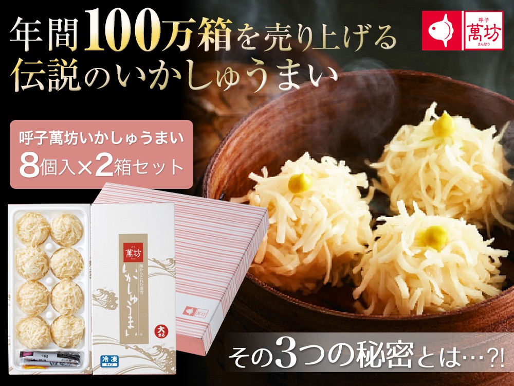 | 容量 | 萬坊いかしゅうまい大まる(8個入)×2箱、 たれ・からし付 |