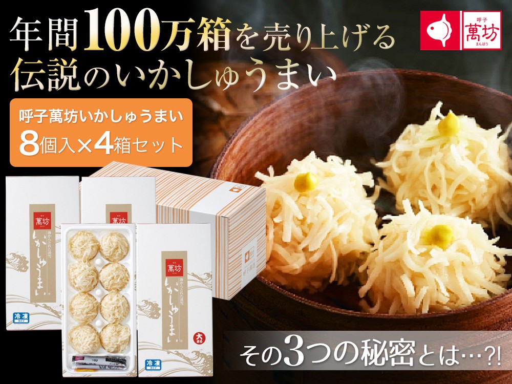 | 容量 | 萬坊いかしゅうまい大まる(8個入)×4箱、 たれ・からし付 |