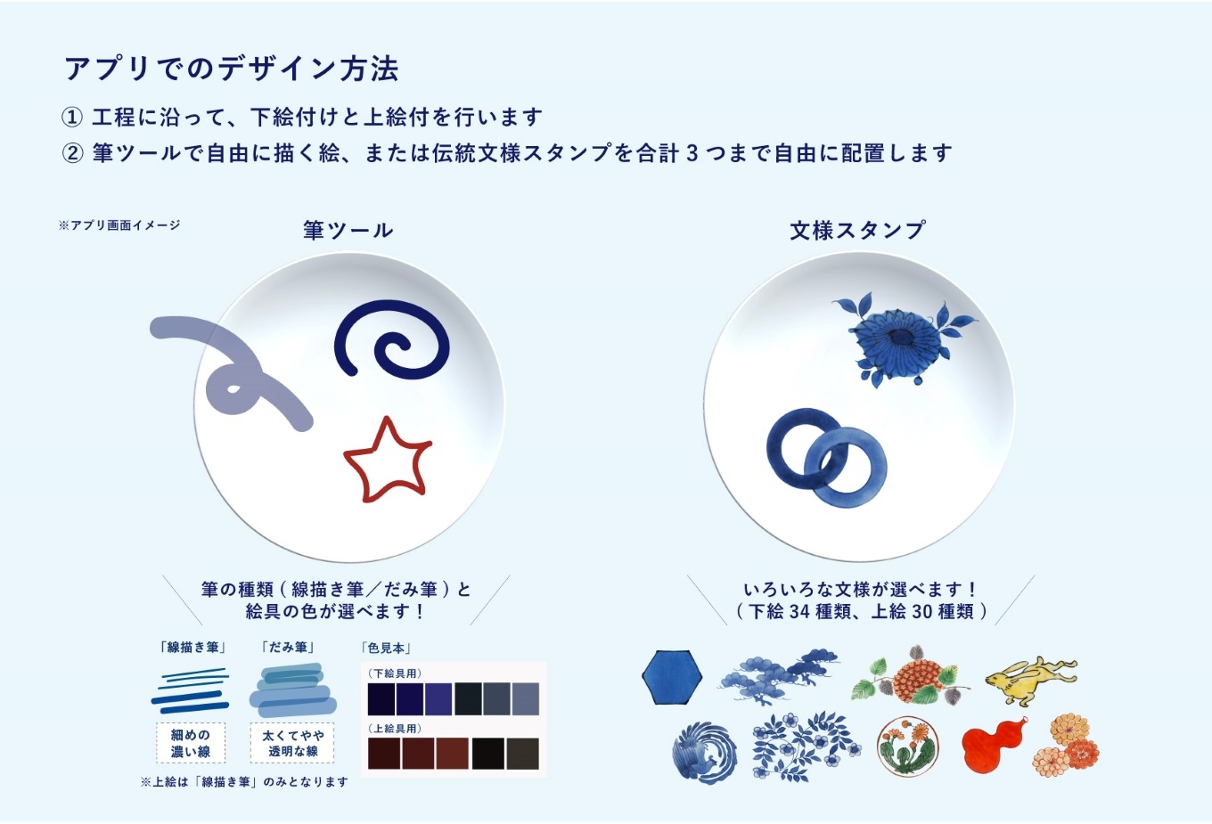 それぞれ下絵付けと上絵付けで、筆ツールで自由に描く文様と、伝統文様スタンプを使用して、合計3文様まで絵付けすることができます。