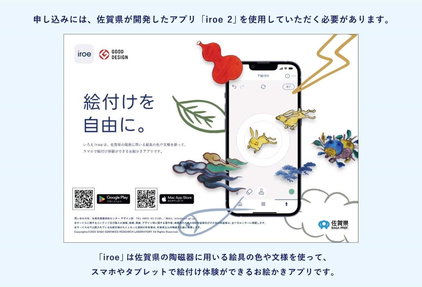 佐賀県窯業技術センターが2023年4月1日に開発。陶磁器事業者向けのカラーチャート機能と、一般向けの絵付け体験機能を持つ。