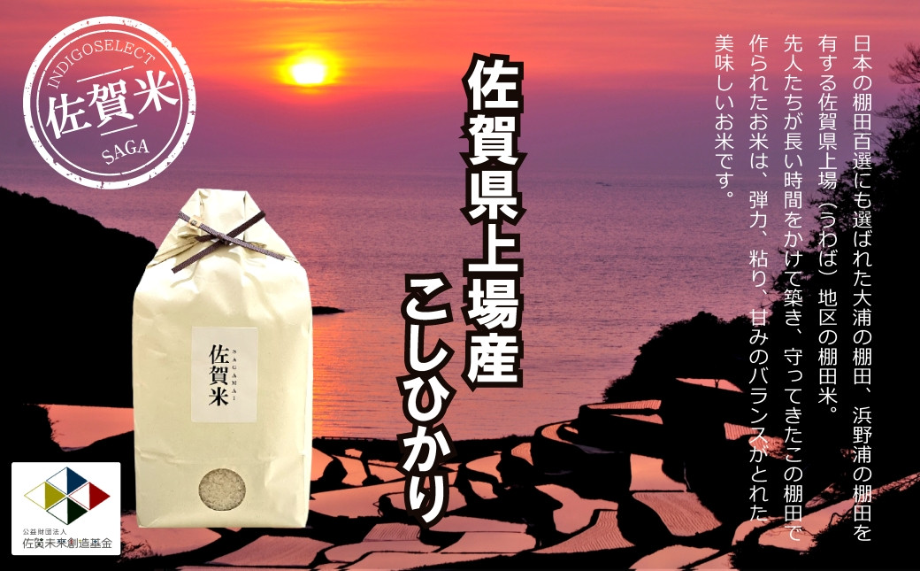 日本の棚田百選にも選ばれた大浦の棚田、浜野浦の棚田を有する佐賀県上場(うわば)地区の棚田米。 先人たちが長い時間をかけて築き、守ってきたこの生活排水が入らない棚田で作られたお米は、 弾力、粘り、甘みのバランスがとれたお米です。