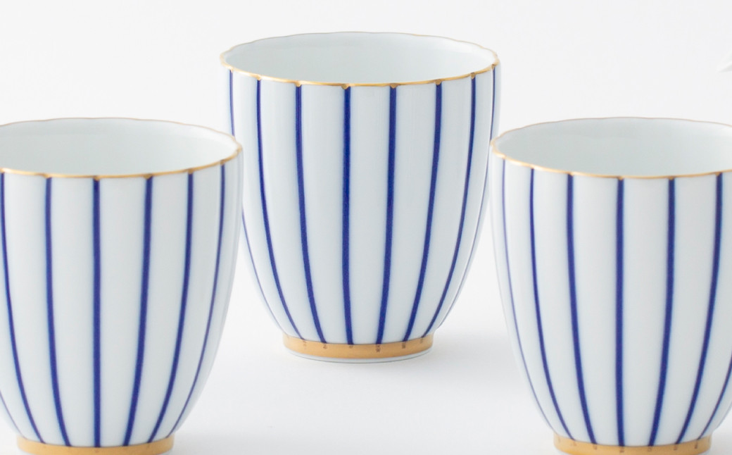 有田焼を代表する老舗メーカーの香蘭社。有田焼の多様な伝統様式を取り入れ、上品で艶やかな「香蘭社様式」を表現しています。これは白、青、緑の3色のコントラストが爽やかな茶器セットです。縦縞に彫り込まれた線には染付、ポットの蓋には青磁釉が施されています。さらにつまみや高台、口縁には金彩が施され、アクセントとなっています。