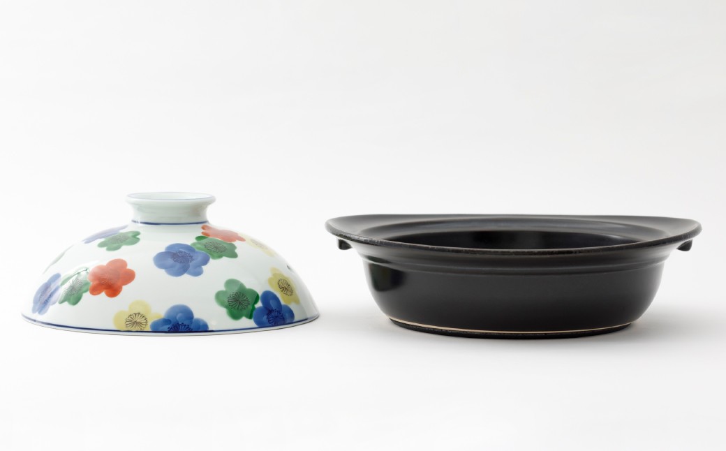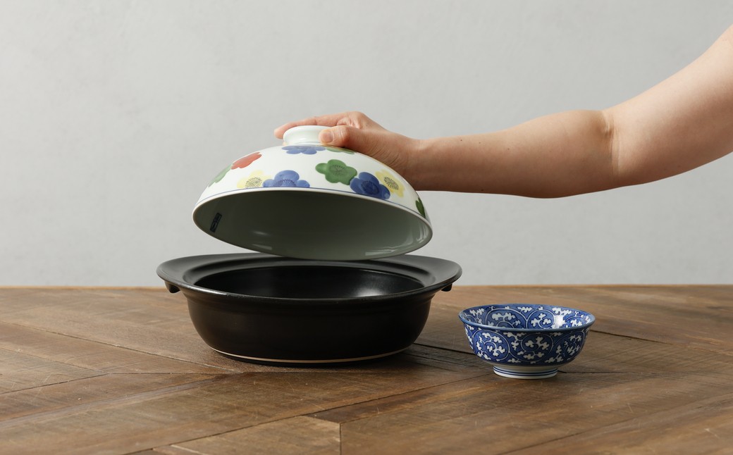 源右衛門窯は古伊万里様式の美を現代に伝えるとともに、積極的な異分野での商品開発で知られる有田を代表する窯元の一つです。鮮やかな色使い、味わい深い手書きの絵付けは数多くのファンを魅了しています。これは、線描きをせず柔らかい筆さばきと大胆な構図で描かれた梅文様が、ポップな印象の陶鍋です。鍋底は特殊な加工が施され、直火とIH機器両方に対応可能です。ふたの取っ手は二重構造のため熱くなりにくくなっています。