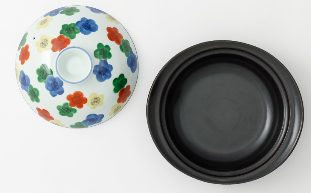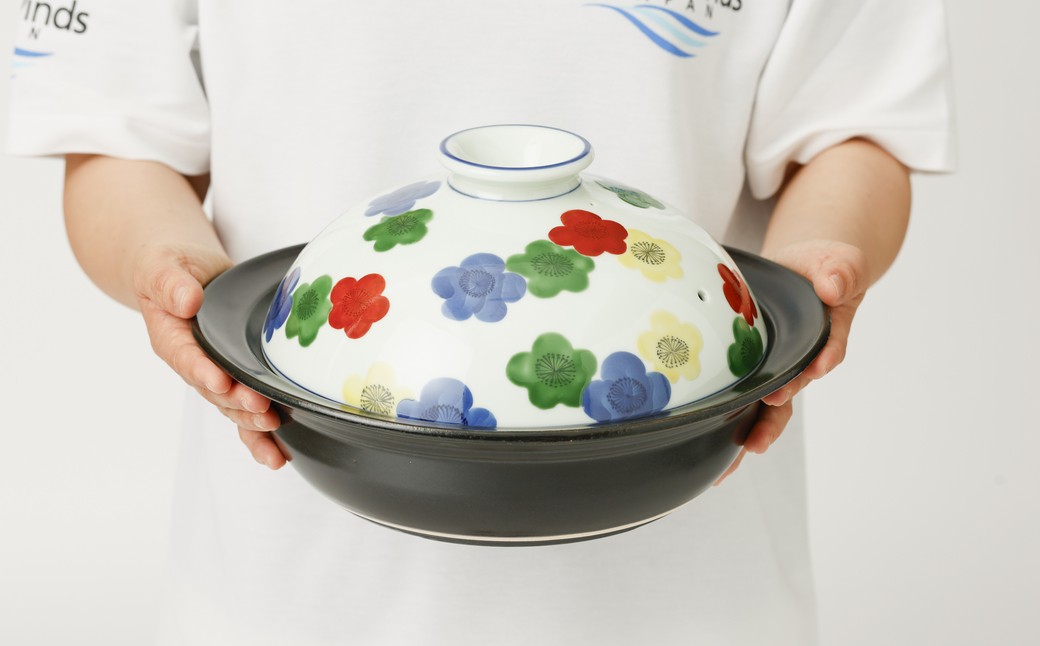 華やかなでポップな梅文様が特徴の陶鍋。IH・直火両方に対応可能で実用性も抜群です