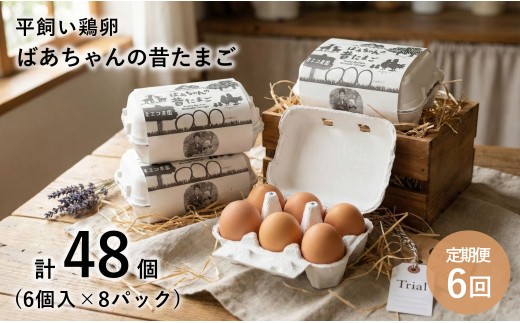 こだわりの詰まった「ばあちゃんの昔たまご」48個を6個入×8パックの小分けにして、計6回お届けします。