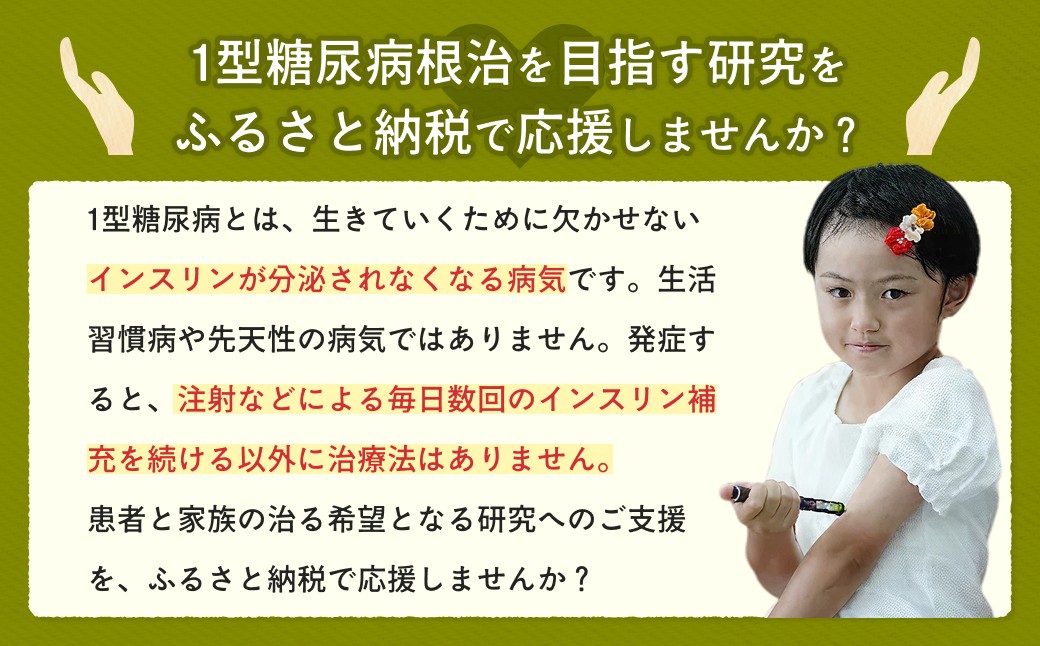 この度、ふるさと納税返礼品にて1型糖尿病根絶へのご支援ができますことを感謝申し上げます。すべての子供たちに明るい未来が訪れますように。