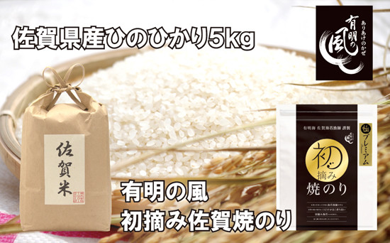 | 容量 | ・佐賀県産ひのひかり 5kg ・初摘み佐賀焼のりプレミアムYP-10(全形8枚) |