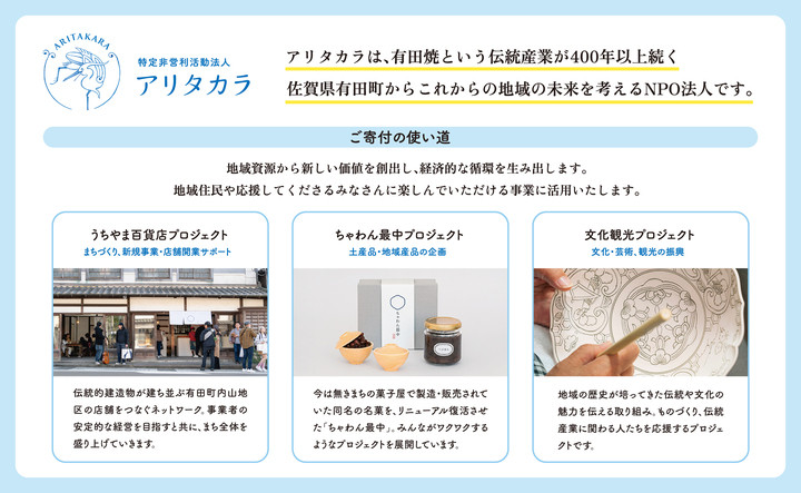 【対象者の要件】寄附金の使途に特定非営利活動法人アリタカラをお選びいただき、3万円以上のご寄附をいただいた方