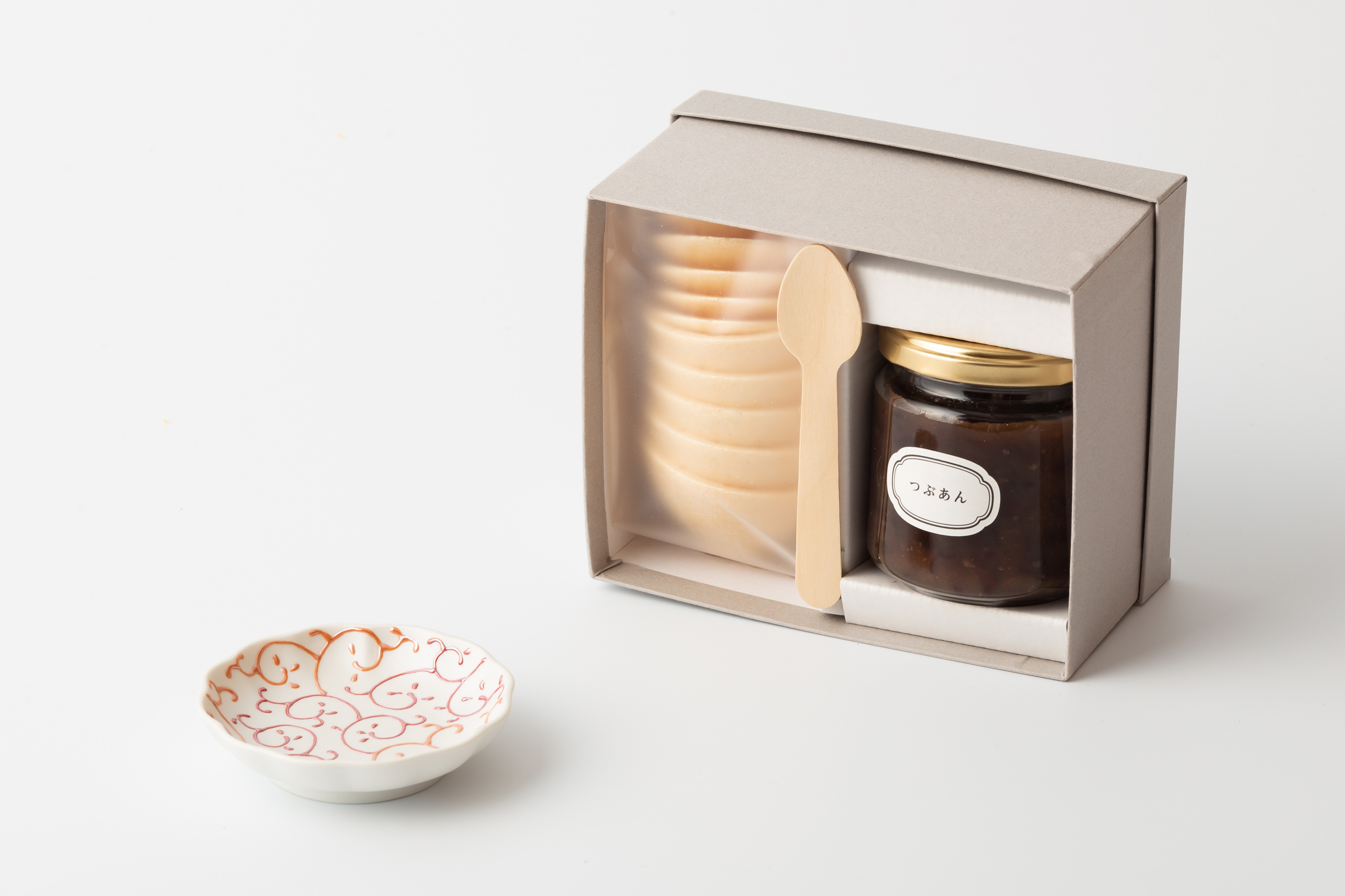 有田焼のふた付き茶わんの形をした香ばしい最中の皮と佐賀の老舗和菓子店「鶴屋」の風味豊かなつぶあんの瓶詰セットです。