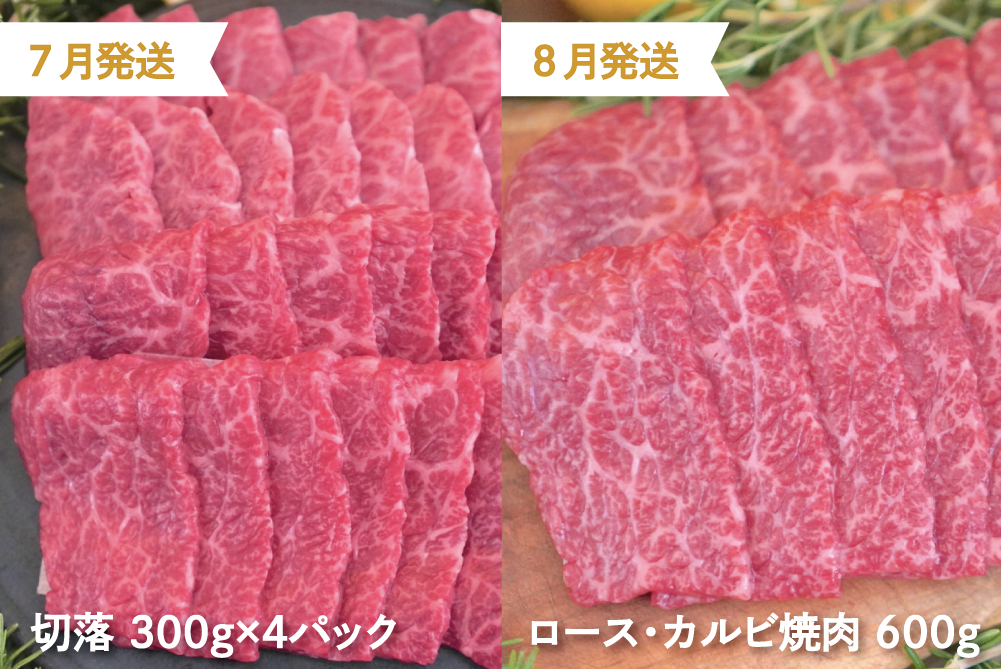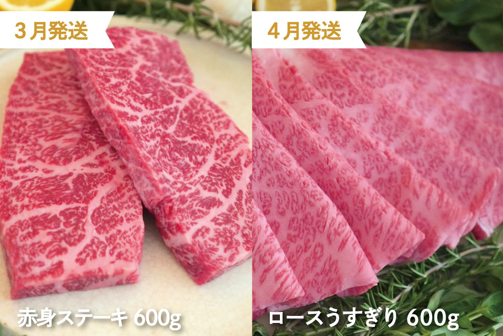 | 容量 | 年12回発送 1月 ヒレ120g×4パック 2月 サーロインステーキ200g×3パック 3月 赤身ステーキ600g 4月 ロースうすぎり600g 5月 赤身焼肉600g 6月 ハンバーグ×10個 7月 切落300g×4パック 8月 ロース・カルビ焼肉600g 9月 赤身うすぎり600g 10月 サイコロステーキ600g 11月 ロースしゃぶしゃぶ600g 12月 ヒレ120g×4パック |