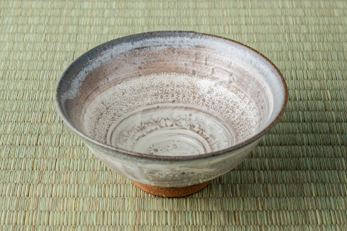 三島唐津とは、赤土に線や印花(いんか)で装飾し、白化粧を施して透明釉をかけたもの。