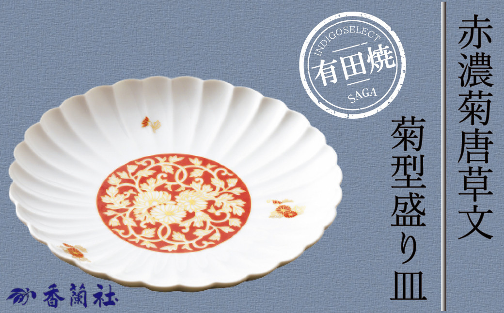 赤濃菊唐草文・菊型盛り皿:原材料(陶土)を仕入れ、成形、素焼き、本焼き、検品、梱包までの全工程を佐賀県有田町の工場で行っているもの