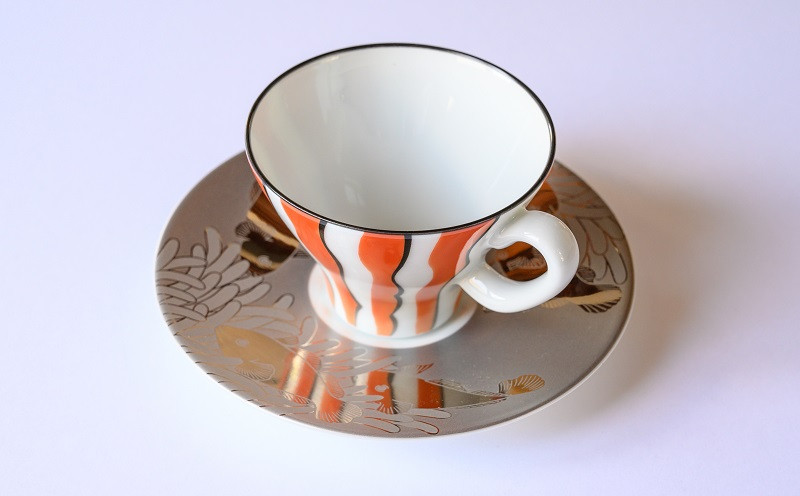 ソーサーにはプラチナ彩がほどこされており、上からのぞき込むとカップの柄がソーサーに映り込み隠れクマノミが顔をのぞかせます。