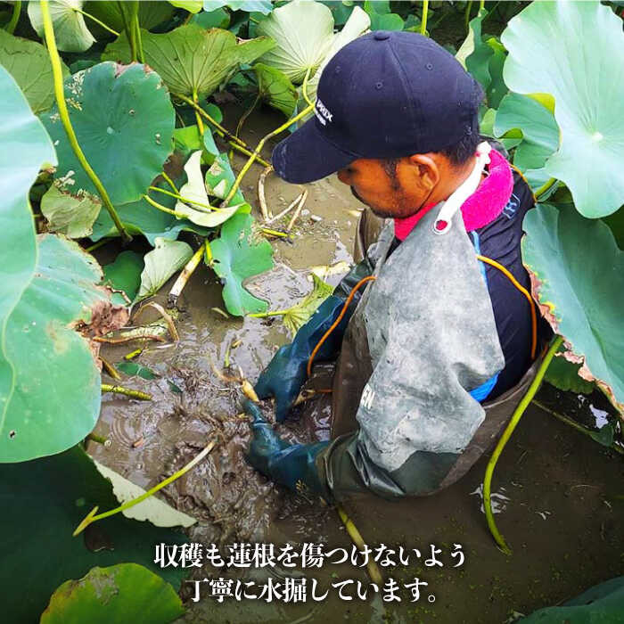 有明海のミネラル分豊富な干拓地で、更に肥料と土作りに、こだわって栽培しています。収穫も蓮根を傷つけないよう丁寧に水掘しています。蓮根はビタミン、ミネラル、食物繊維、ポリフェノールなど、いくつもの栄養素を豊富に含んでいます。健康や美容にも効果があり、古くから漢方薬としても重宝されています。そんな身体にやさしいれんこんをぜひ一度お召し上がりください。洗ってお届けいたします。