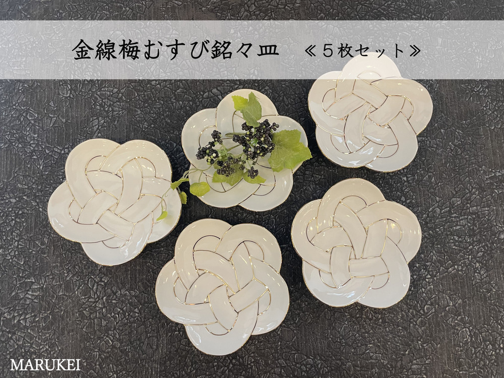 水引きの結びをモチーフにした縁起のよいデザイン。 艶やかな表面が上品で綺麗です。 【有田焼】田清窯 金線梅むすび銘々皿 5枚セット