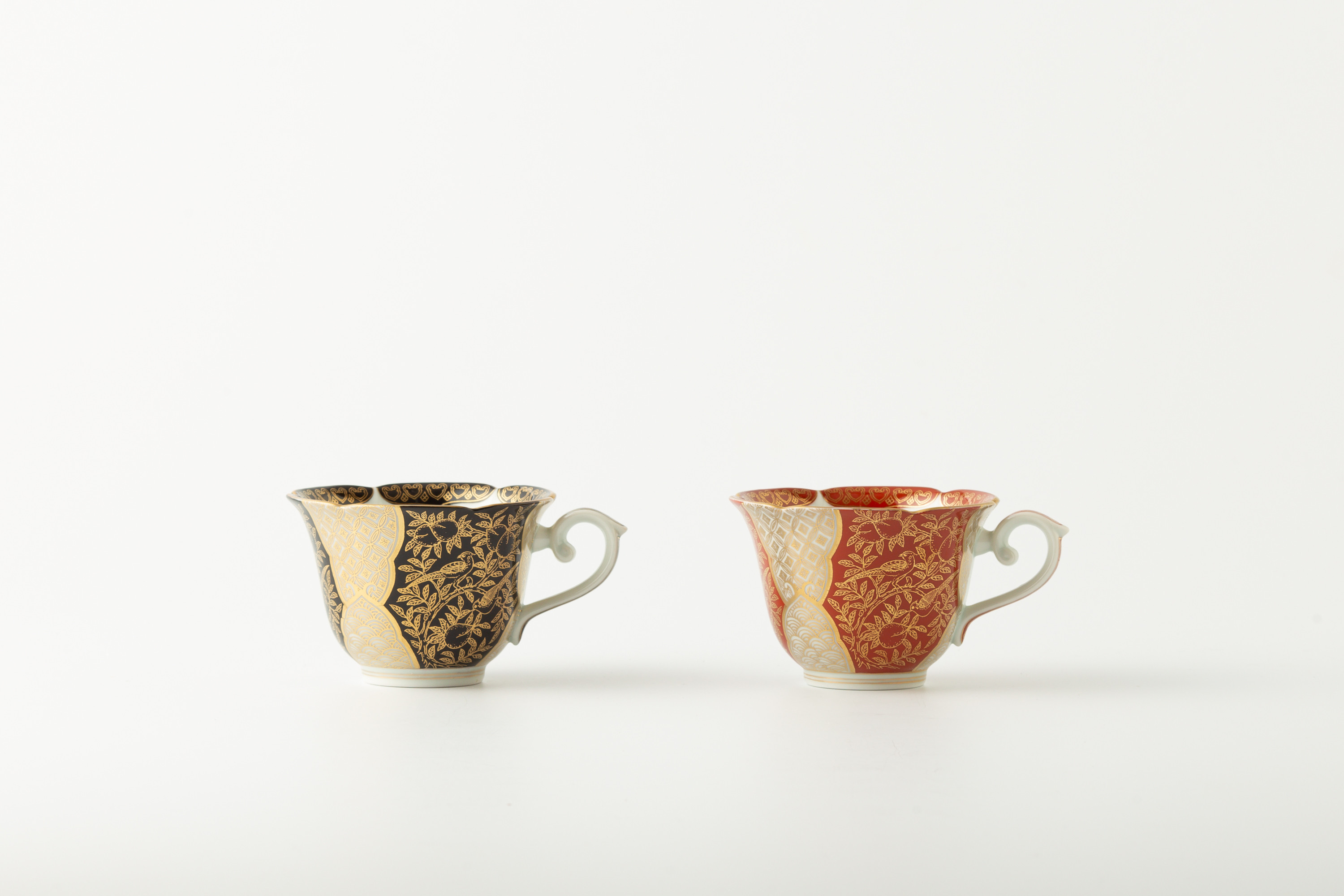 金彩の文様が華やかなティーカップ&ソーサ―です。「長寿」や「厄払い」の謂れがある「桃」をモチーフにした文様で、ティータイムを華やかに演出してくれます。シックな黒・鮮やかな赤のペアでお届けします。