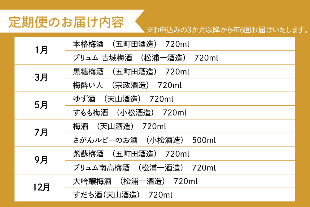 | 容量 | 毎回異なる果実酒2本をお届けします。 《1月に発送》 本格梅酒(五町田酒造) 720ml×1本 プリュム 古城梅酒(松浦一酒造) 720ml×1本 《3月に発送》 黒糖梅酒(五町田酒造) 720ml×1本 梅酔い人(宗政酒造) 720ml×1本 《5月に発送》 ゆず酒(天山酒造) 720ml×1本 すもも梅酒(小松酒造) 720ml×1本 《7月に発送》 梅酒(天山酒造) 720ml×1本 さがんルビーのお酒(小松酒造) 500ml×1本 《9月に発送》 紫蘇梅酒(五町田酒造) 720ml×1本 プリュム南高梅酒(松浦一酒造) 720ml×1本 《12月に発送》 大吟醸梅酒(松浦一酒造) 720ml×1本 すだち酒(天山酒造) 720ml×1本 |