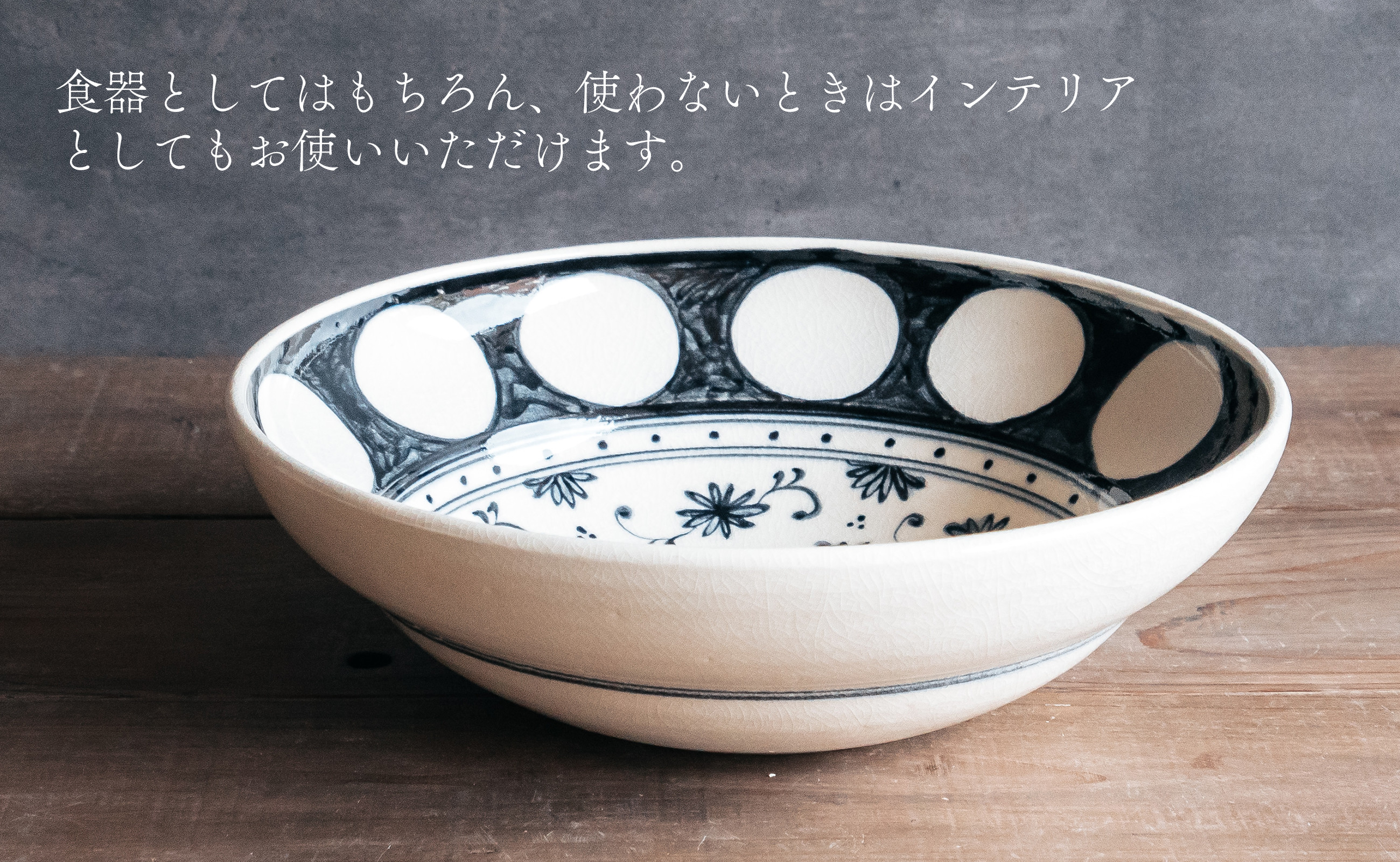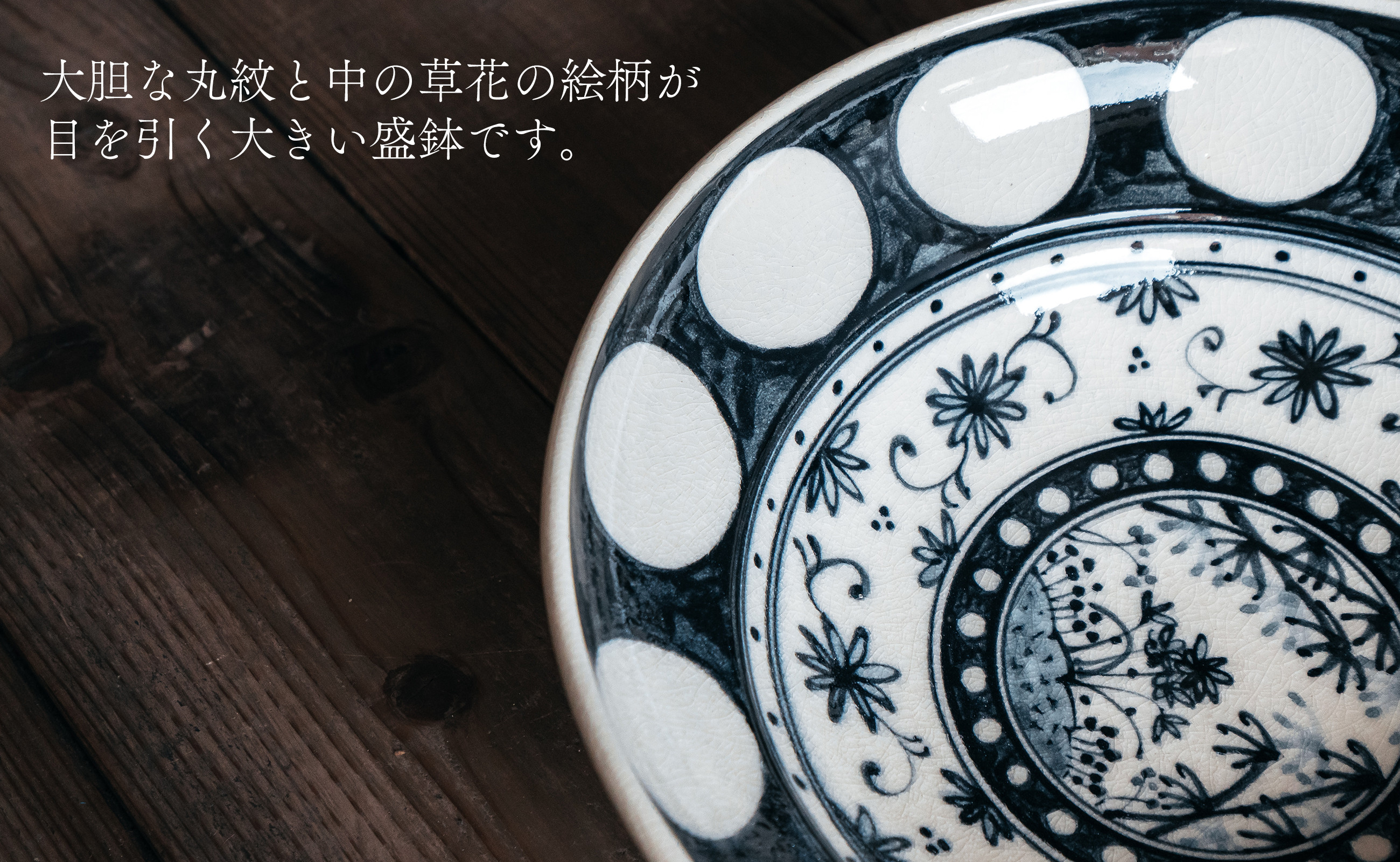 大胆な丸紋と中の草花の絵柄が目を引く大きい盛鉢です。