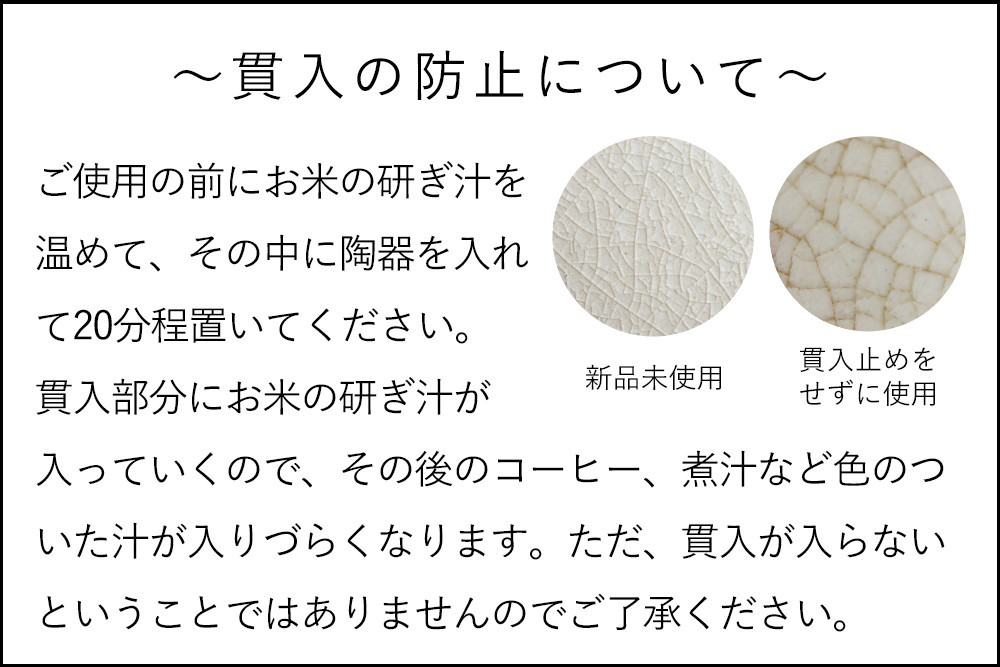 貫入部分にお米の研ぎ汁(白)が入っていくので、その後のコーヒー、煮汁など色のついた液体が入りづらくなります。