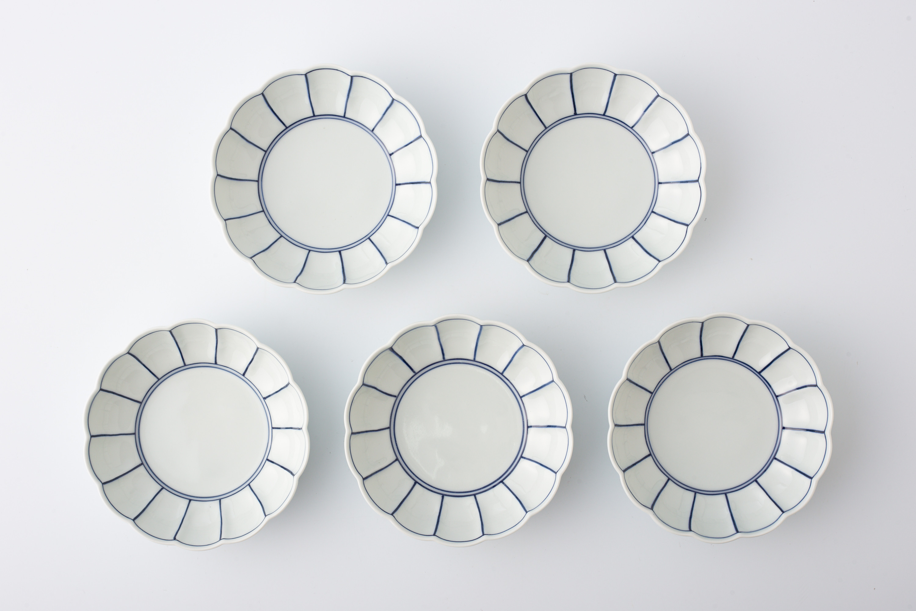 【カネアオ】有田焼 皓洋窯 菊割小鉢 染付ふちどり 5個セット
