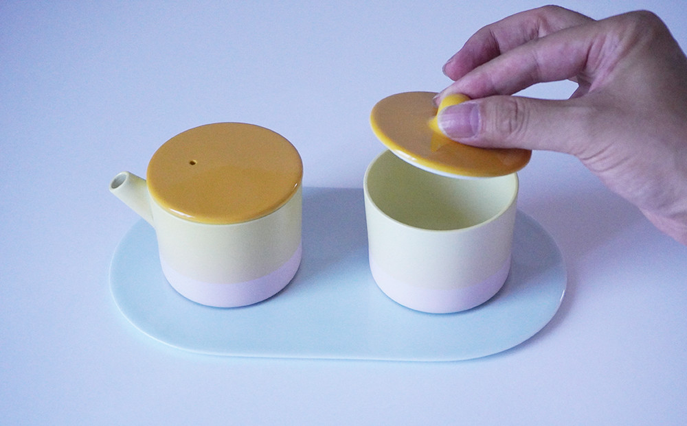 現代的で非常に機能性の高い形の中に、有田の特有の色遣いが反映されています。 【有田焼 1616/arita japan】S&B MilkCan & SugarCan & Platter Set Yellow/LightPink