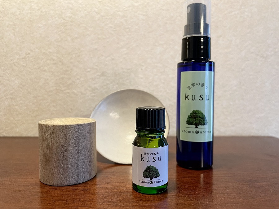 佐賀の香りkusuは、県木であるクスから精製したクスノキ精油をベースに、柑橘系の香りをブレンドしたオリジナル精油です。小皿の上にクスノキで作られたアロマディッシュを載せて、上に1~2滴垂らしてお使いください。