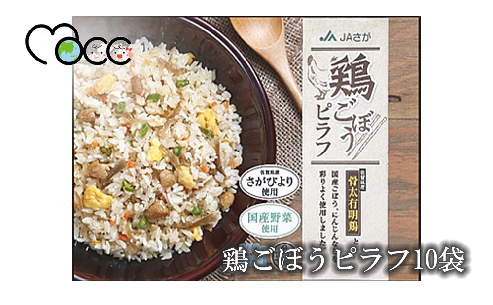 県産骨太有明鶏と国産野菜(ごぼう、にんじん、いんげん)を使用した和風タイプのピラフです。佐賀県産米「さがびより」を使用しています。