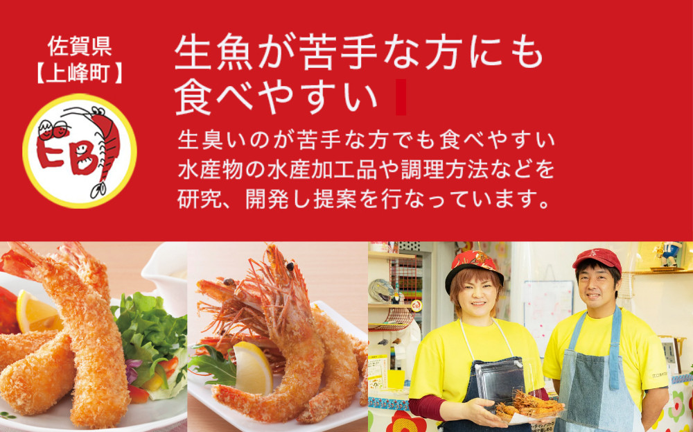 神えびフライ:告示第5条第3号:原材料(海老、卵、小麦、塩)を佐賀県外から仕入れ、捌く、衣付け、梱包までの全工程を佐賀県の店舗で行っている。