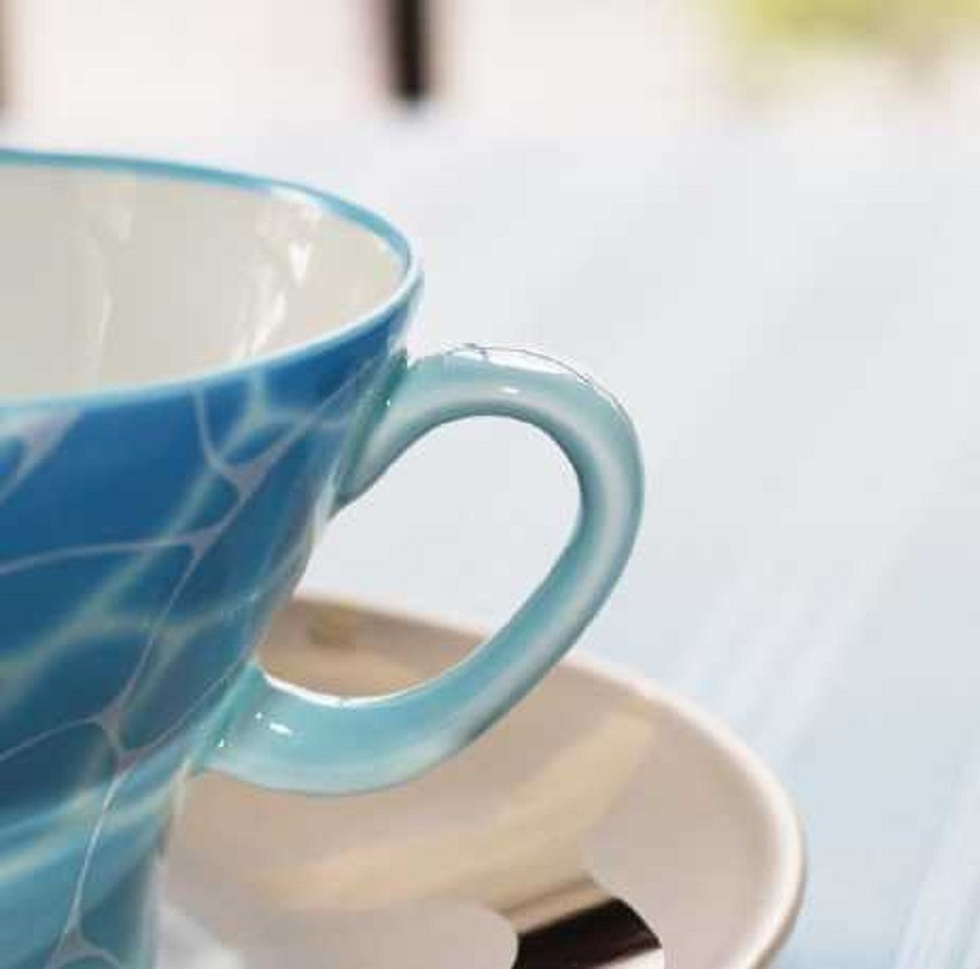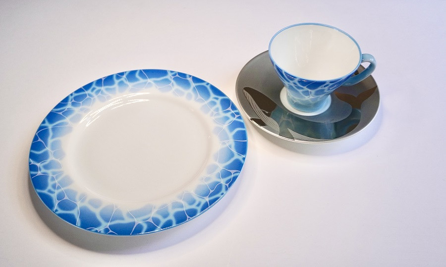 キュートなカップにデザインした海の水面が、ソーサーの美しいプラチナ面に映り込むと、大海原を悠々と泳いでいるクジラの親子の姿に。遊び心のあるカップ&ソーサーとケーキ皿のセットです。