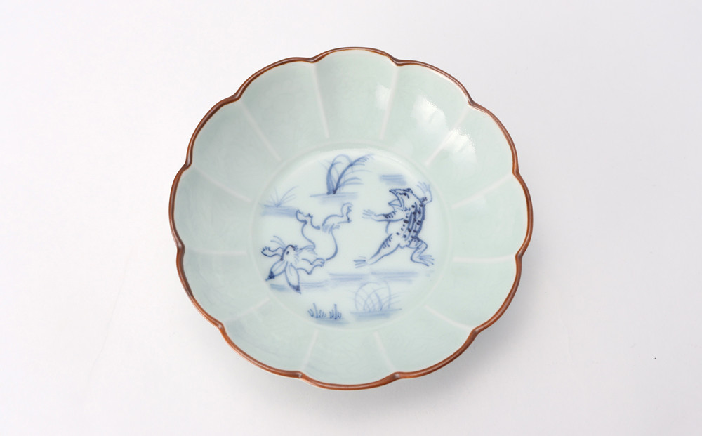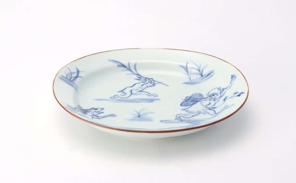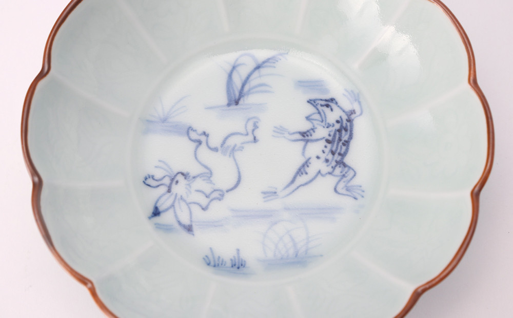 『鳥獣戯画』の猿・兎・カエルの三匹が戯れるシーンが描かれた焼き物です。