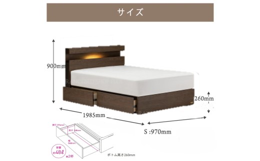 容量 | 【ベッドフレーム】 サイズ:シングル 幅970×長さ1985×ヘッドボード高900×フットボ-ド高260 フレ-ム高さ260mm(左右どちらも引出し設置可能) フレ-ム引出内寸:幅868×奥行374×高さ148mm×2杯 素材:(主材)抗菌化粧板、(床板)スノコ床板(表面ウェ-ブ加工) フレームカラー: ※お色を下記より選んでいただき、ご寄付の際に必ず「応援メッセージ」欄にご記載下さい。 ・グレー ・ウォールナット 【マットレス】 サイズ:シングル 幅970×長さ1950×高さ240㎜ 重量約17kg |