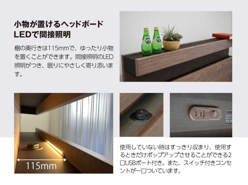 ・小物が置けるヘッドボ-ドにポップアップ式の2口USBポート付き