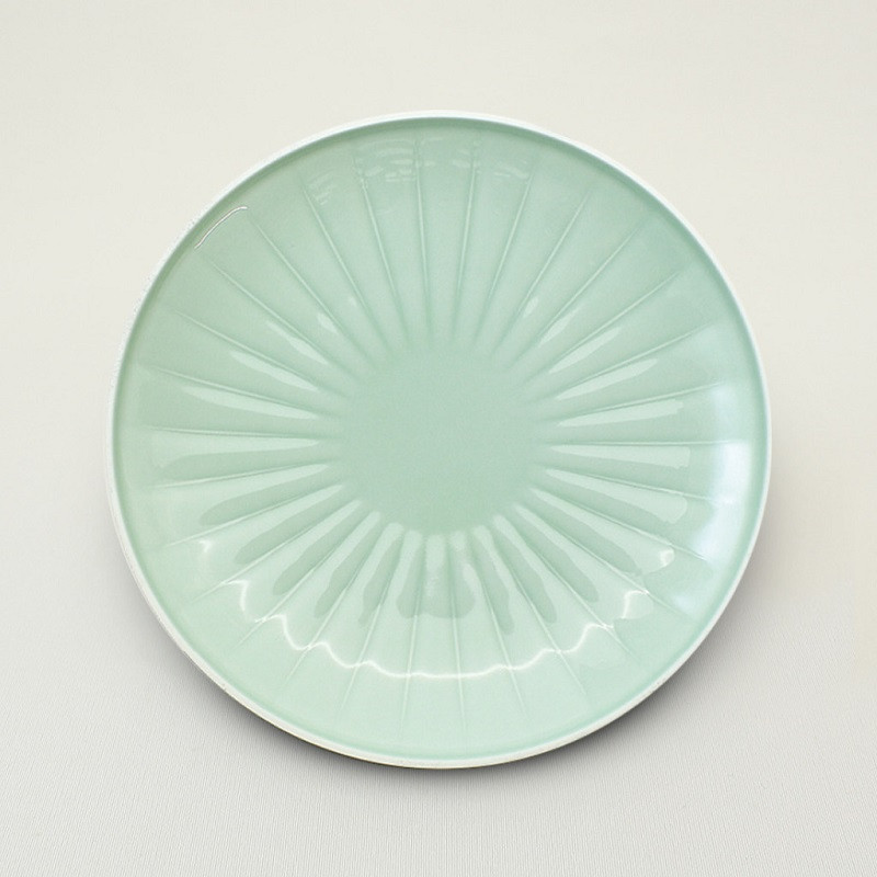 ストライプのエンボスを施した緩やかな曲線を描くフォルムに、青磁の爽やかで優しい色味の釉薬のプレートです。内外での質感の違いによる楽しさ、使いやすさにこだわり、手に触れる外側は香蘭社が得意とするブラスト加工によるマットなしっとり感、内側は透明なつや感が特徴です。
