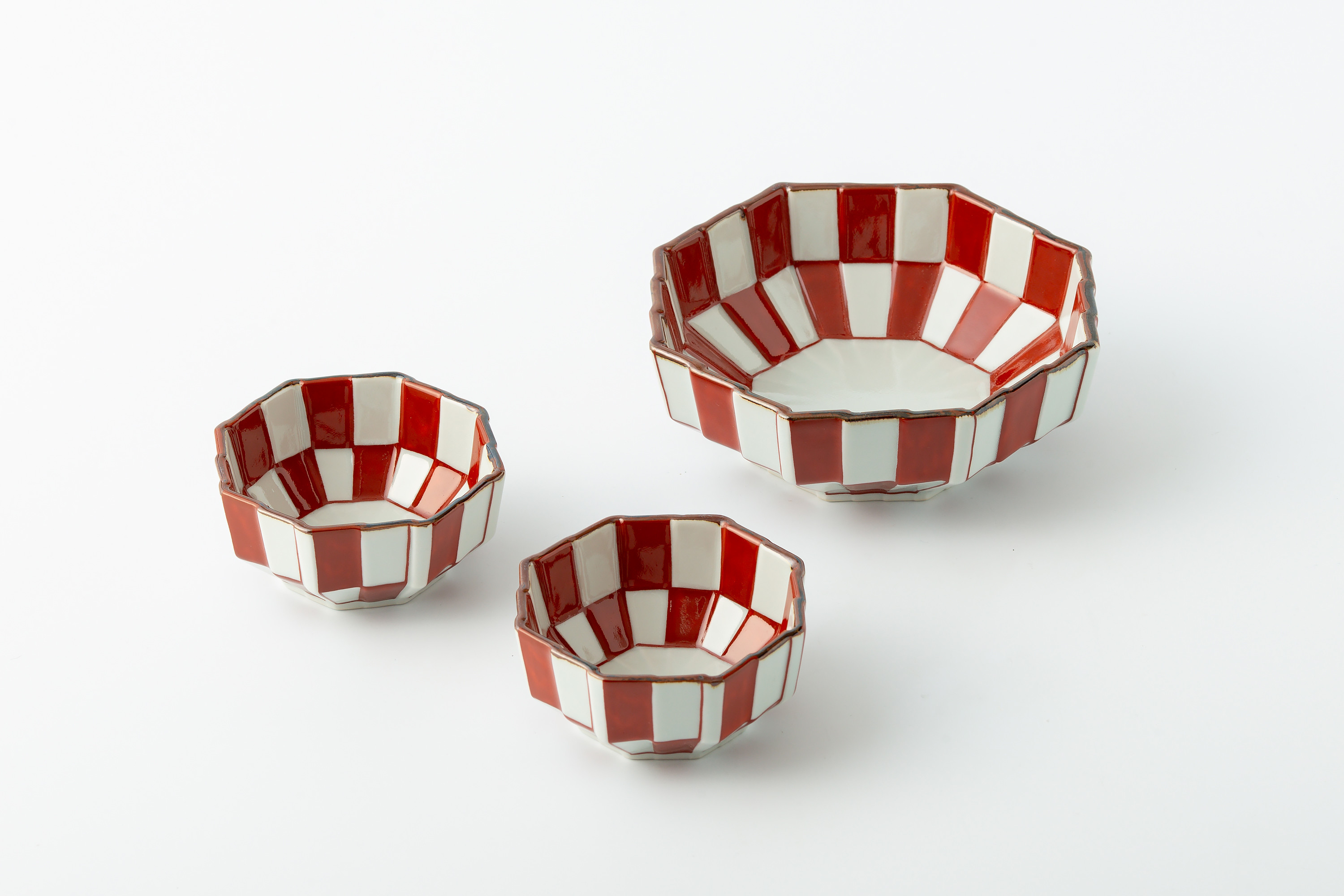【セット】カネアオ 有田焼 束八角小鉢2個・多用鉢1個(赤市松) 福泉窯