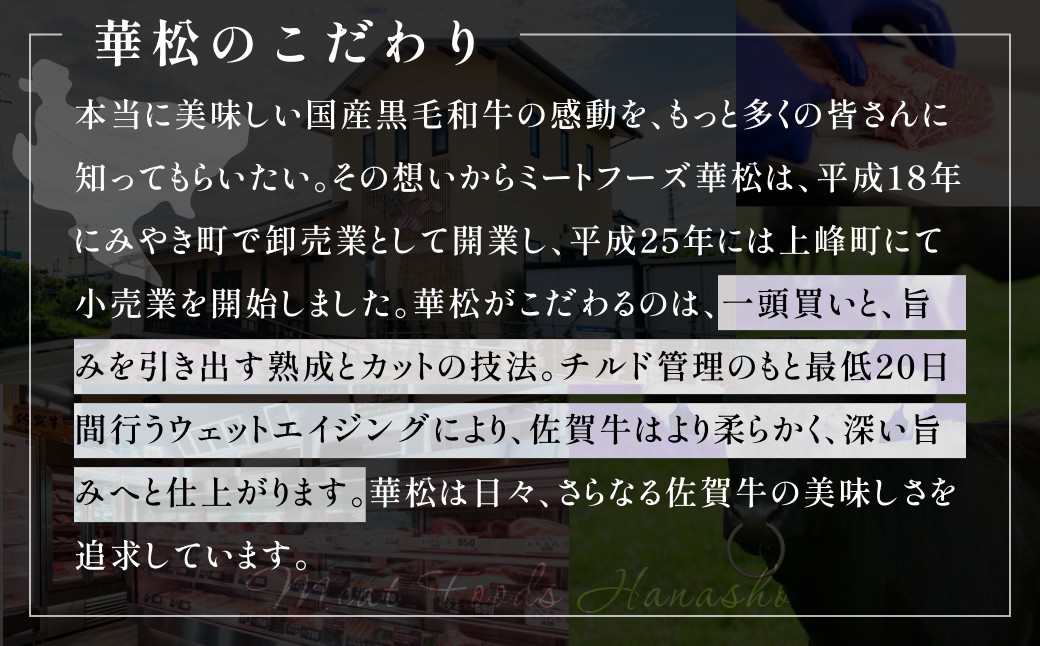 ・ウワミスジ:第1号:佐賀県内で肥育された佐賀牛を仕入れ、三養基郡上峰町内にある精肉店で加工されている。