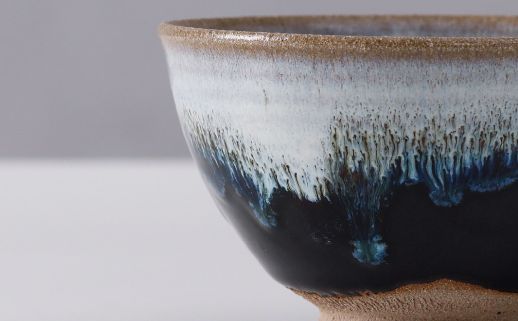 力強いフォルムが特徴、珍しい刳貫(くりぬき)技法で製作された抹茶茶碗。半筒茶碗。