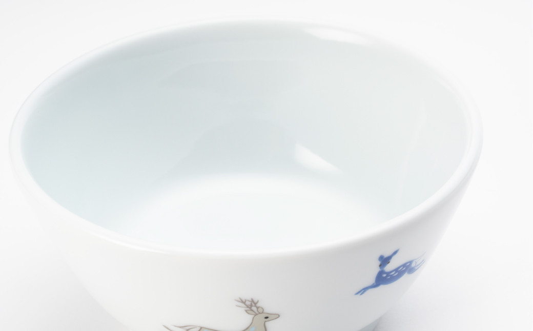 有田の工房6名の女性職人によって制作された「オツカレサマ、ワタシ」シリーズ。神の遣いである吉祥文様のかわいい子鹿たち。 「ほっとひと息がつける」デザインと新形状のカタチです。11cmの小鉢サイズで、サラダボールやアイスクリーム、そして秋冬にはおでんの取り皿などにもおすすめです。ブルーとグレーをペアにしております。ギフトにもおすすめです。