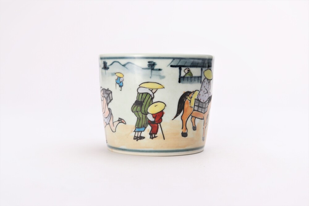 昔の宿場町を行き来する人々を描いたそば猪口です。 【有田焼】染錦宿場往来そば猪口 2個セット 丸兄商社 円左ェ門窯