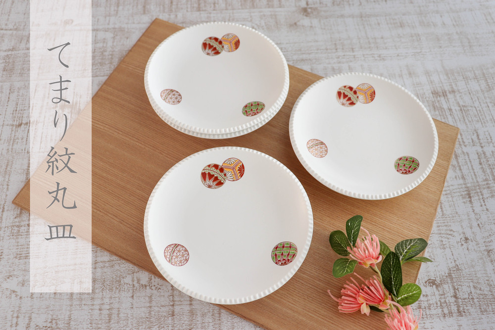 質感はマットで、可愛らしいてまり模様がデザインされています。 【肥前吉田焼】てまり紋丸皿(中) 4枚セット 丸兄商社 与山窯
