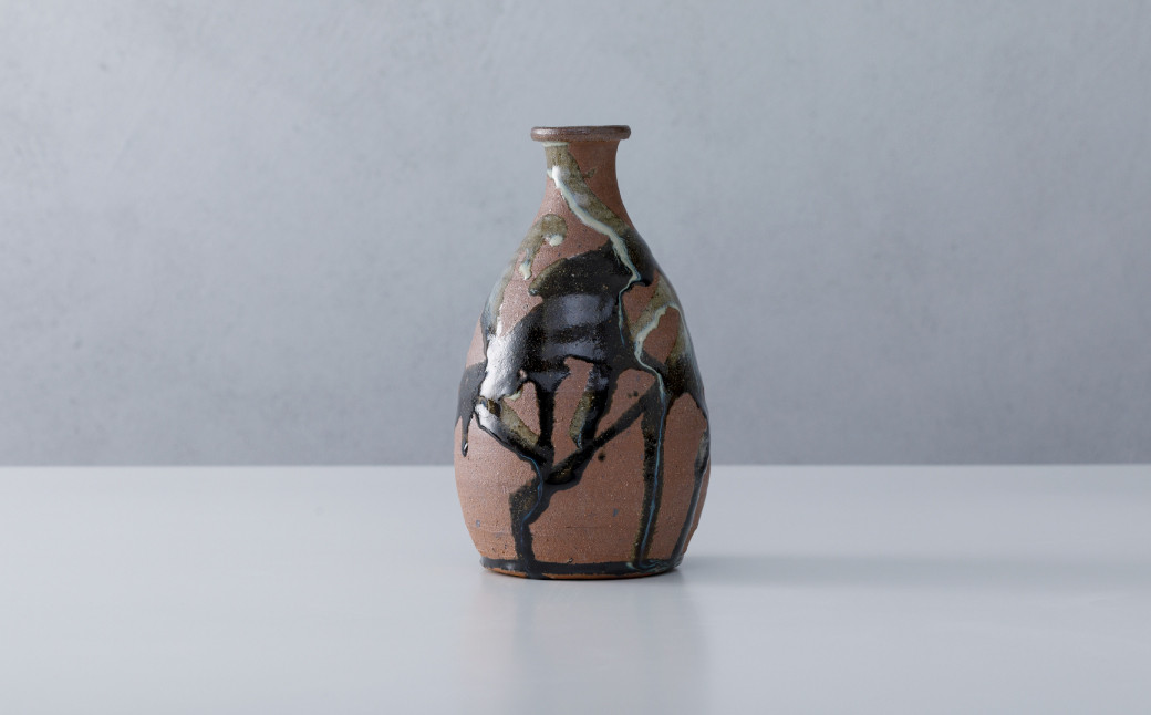 こちらは藁灰釉と飴釉の2つの釉薬がかけられた朝鮮唐津の花入れです。ひしゃく掛けという技法で釉薬をかけることで、素地が大きく見え、勢いよくかかった釉薬の流れが格好良いですね。